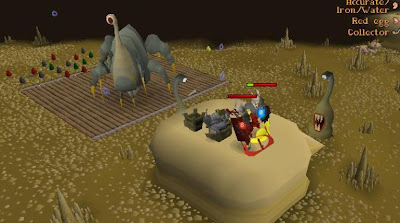 O ovo deverá ser passado de pessoa em pessoa, cada uma fazendo algo para transformá-lo em ômega. O coletor deve pegar o ovo amarelo e usá-lo com o curandeiro, e no final levar o ovo ômega ao lançador. O curandeiro ao receber o ovo amarelo deve usá-lo com a piscina de veneno (verde borbulhante) e passar ao atacante. O atacante quando receber o ovo amarelo envenenado do curandeiro, deve usá-lo com o espinho de um dos cogumelos encontrados na arena.
