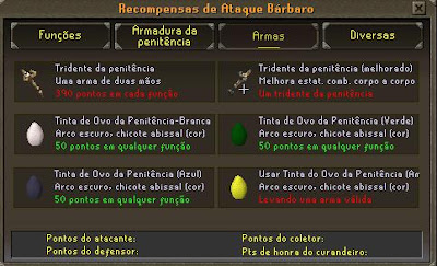 É proibido levar flechas e runas, a capa é retirada automaticamente assim que você desce a primeira escada, poções podem ser levadas na arena. Uma boa dica para o atacante é levar armas como maça ou cimitarra dragônica, já que o estilo que causa dano nas penitências muda frequentemente, assim, chicote abissal não é recomendado pela falta do estilo de ataque "agressivo". Seus pontos de honra podem ser checados em quadros negros e há um depósito próximo ao Capitão Cain.