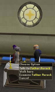 1 - Fale com Padre Aereck na igreja de Lumbridge, e pergunte-lhe se ele tem uma missão para você; Ele dirá que precisa de alguém para fazer com que o fantasma no cemitério vá embora; Ele menciona que o seu amigo Padre Urhney pode ajudar;